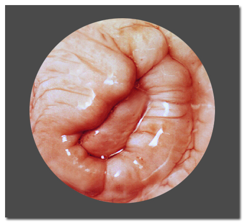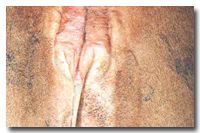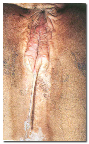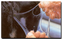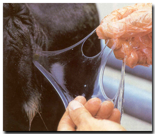 Die Schleimhaut in der Scheide ist meist blassrosa und feucht, da die Gebärmutter bzw. der Muttermund (Cervix) Brunstschleim (spinnbar und klar) produzieren. Der Muttermund kann bis zu bleistiftstark offen sein.